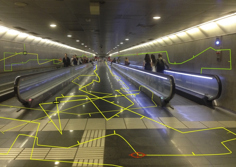 Hemos creado una gráfica a partir de la apropiación de la simbología, iconografía y señalización utilizada por parte del Transporte Metropolitano de Barcelona (TMB) y Google Maps, con el fin del contraponer lo “representado” con la “realidad” del “espacio público”, siendo en este caso la gráfica lo que llamamos el “mundo virtual”. Así mismo en estos territorios de transición y viaje la dependencia de dispositivos móviles de alguna manera imposibilitan la emancipación del “imaginario” o pensamiento crítico, debido a una enagenación colectiva con respecto a dependencia de dispositivos móviles, como consecuencia de los procesos globalizadores .